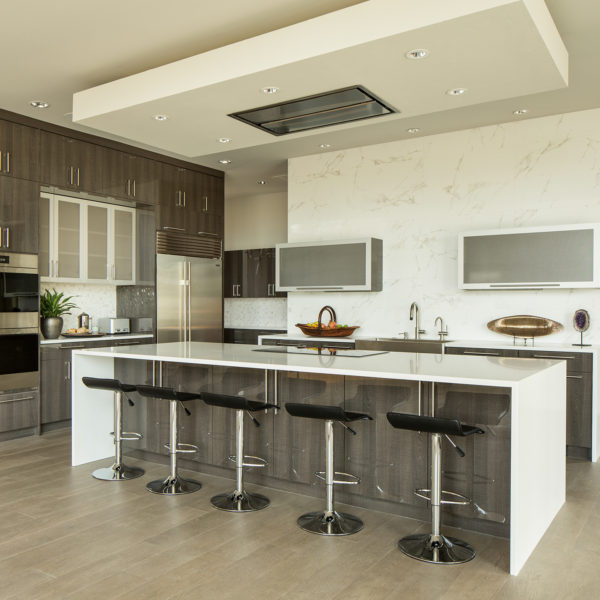 My clients love to entertain and often throw parties for up to 100 guests. They wanted a super modern kitchen that would accommodate a good sized buffet area. This 10-foot long island is about 4-1/2 feet wide, and accommodates guests at counterstools all along one side. We went with an induction cooktop, both for the superb temperature control, and also for the ability to treat it as buffet space after food prep is done. As large as this kitchen is, it still feels comfortable for daily use with its coffee station and an eat in dining area (not pictured). High gloss gray cabinetry, is paired with Carrara marble-look porcelain tile for a modern, yet timeless look. The flush mounted ceiling range hood allows uninterrupted views throughout the open plan great room.
