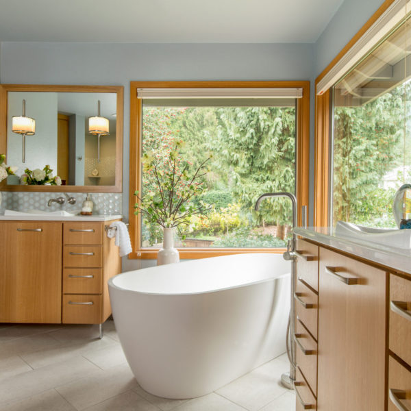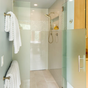 This client was looking to update and upgrade a master bathroom that had a dark shower and an outdated corner jetted tub. We reoriented and enlarged the shower so that it now opens into the main bathroom and is filled with light through a glass enclosure. New custom vanities and a beautiful freestanding tub completed the transformation to a light and bright morning haven.