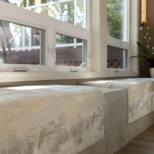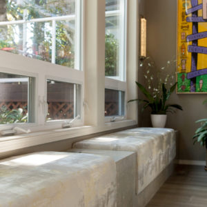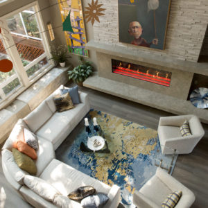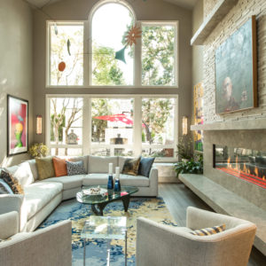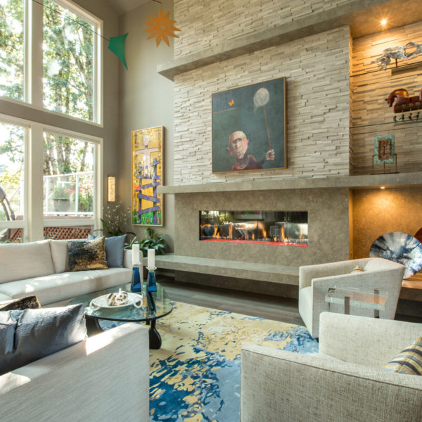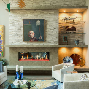 This couple was ready for a serious update of their two story living room. The fireplace style was outdated, and the existing furniture was too small, or underscaled, for the room. Our design completely remodeled the fireplace and niche, creating a floating hearth and linear fireplace clad in limestone slabs and limestone stacked stone. We also designed an upholstered window seat area along the windows. It is sleek and minimal looking, and deceptively comfortable, with cushions recessed into the framing and webbing support below. The furniture and area rug are all custom and made-to-order pieces that pull in the colors of their extensive art collection, while providing ample comfortable seating for entertaining guests.