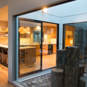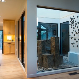This home also featured a unique, central atrium, but it had become an underused eyesore with aging wood decking. Large picture windows replaced the smaller ones, allowing ample natural light into the center of the home. A five-column faux basalt fountain surrounded by a bed of river rock is paired with nature inspired wall art to become a stunning focal point at all angles.