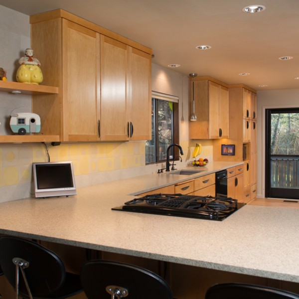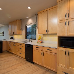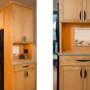 This busy mother of three loves being the host to the neighborhood kids, but was frustrated with her cramped kitchen with beat up wood floors and poor lighting. The family also wanted the kitchen to function better for office and homework needs.