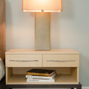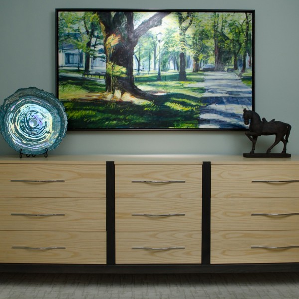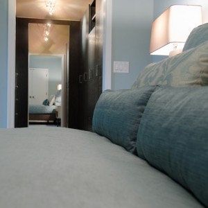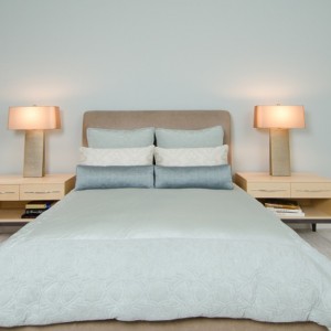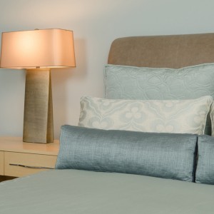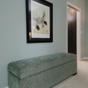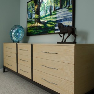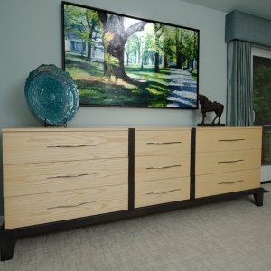 When this couple first approached Pangaea, they exclaimed that they “couldn’t even decide on a ceiling fan!” When Pangaea arrived, she found a spacious master bedroom…completely empty. Fortunately, this provided a nice clean slate to begin the design. All of the furniture in the room is custom designed. The bed is fully upholstered in leather, and topped with custom made bedding and feather down pillows. It is flanked with unique side tables which match the dresser. The dresser was built about 18″ longer than most prefabricated dressers, maximizing the entire wall space. A custom bench adds much needed blanket and linen storage and is a comfortable spot to sit and put on shoes. Custom drapery panels were topped with a simple cornice to add to the minimal look. As for that ceiling fan? Pangaea found them a unique three-bladed one that keeps them cool and looks cool too!