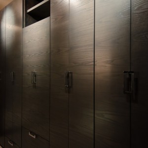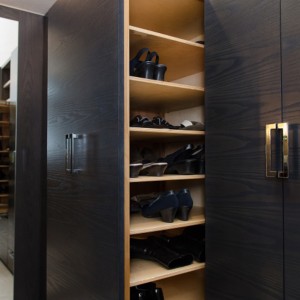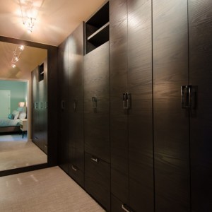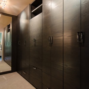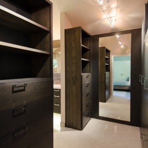 Pangaea designed the cabinetry, which was finished with a gray stained ash. The grain was run horizontally, and matched along the length of the cabinetry for a seamless look. Pull-outs were used in unique ways, including a shoe caddy and built-in hamper, so no space was wasted. The closet was divided into “his” and “hers” sides, to give each person their own hanging space, built in dresser, and open shelving. A large mirror was framed in a matching grey stained ash against the back wall, for functionality, and to visually enlarge the room. Cable lights provided flexible and even lighting into each closet space. The entire design now allows a beautiful passage into the master bathroom, while being a functional dressing and storage area.