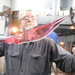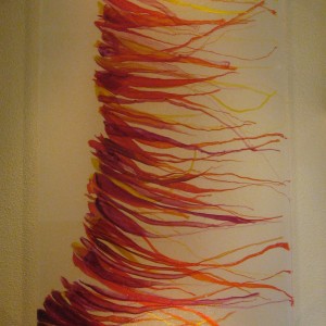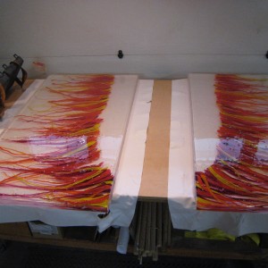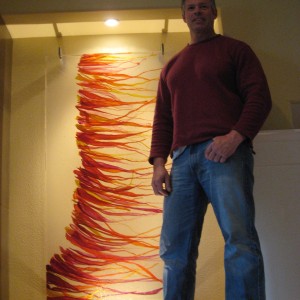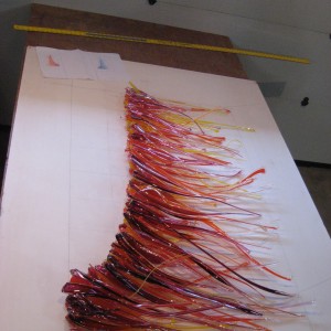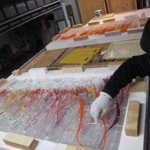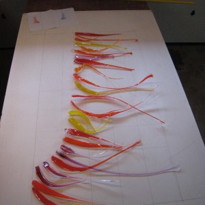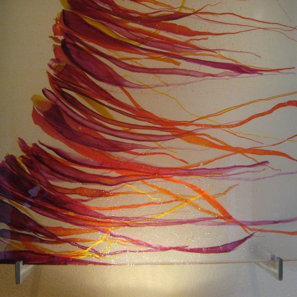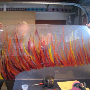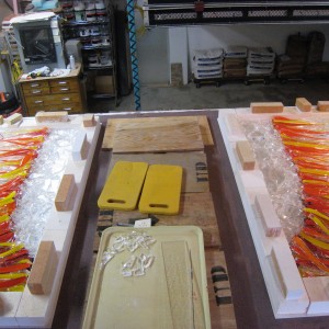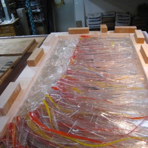 The process was a lengthy one. After creating a design and basic sketch to scale, we began work in a glass blowing studio creating the colored strands by heating colored glass, coating it with clear glass and then stretching them into the sweeping shape desired. Dozens of these strands in multiple colors were made. Then I began laying out the strands on a full size pattern to see how it would look and adjust the layout. Both panels were laid out right side up, then reversed face down for the firing process. Once the colored strands were laid out, we began interweaving clear glass pieces throughout for separation so that the colored strands would appear to float. Both panels were then put into a giant kiln and fired face down first so that all bubbles would rise toward the back of the pieces. Then they were flipped over and fired face up just enough so that the front of the glass would be perfectly smoothed. The edges were then ground and polished. A custom welded holder for the panels was mounted above each niche. As you can see, it took four men to left the piece into place and safely set them into their holders.