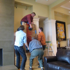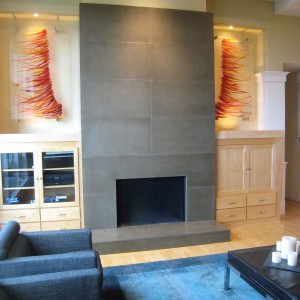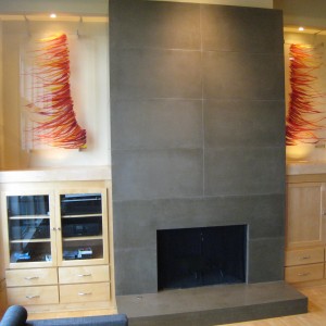 I have always been enamored with glass art and enjoyed glass blowing and glass casting for many years before turning to interior design. From time to time, I get an opportunity to create art for my clients. For this client we wanted large companion pieces to flank either side of the massive concrete fireplace. I designed glass panels and worked with Ray Ahlgren of Fireart Glass in Portland, Oregon to execute the design. Each panel is 30″ wide, 54″ tall, 1-1/2″ thick, and weighs 220 pounds.