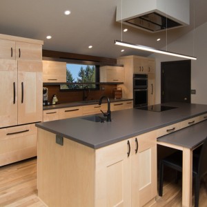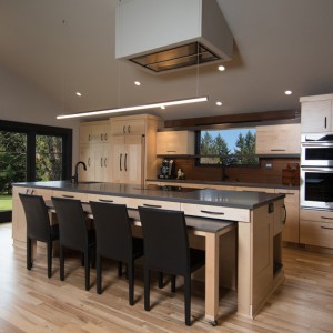 This client came to us with a very small, outdated kitchen, and a little used outdoor patio right beside it. The ceiling in the main living area had angles going every which way, and the ceiling in the kitchen was unusually low. So we ditched it all, and literally raised the roof, creating a single plane that angled down towards the back of the newly expanded kitchen that now encompasses the patio area. This allowed a blank slate to design a kitchen that truly fit the client’s lifestyle.