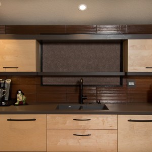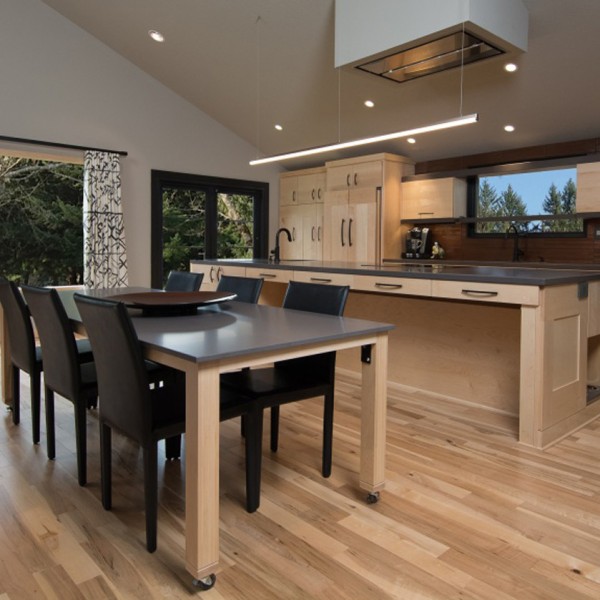 They expressed the need for a dining table “once in a while,” but didn’t really want to have a permanent space dedicated to one. So our design began with the island, where we’ve built in a custom rolling dining table. Most of the time, the table rolls right under the island, where about one foot of it projects out to become the bar area. When fully pulled out, the eight foot long table can comfortably seat 10 people for a family get-together.