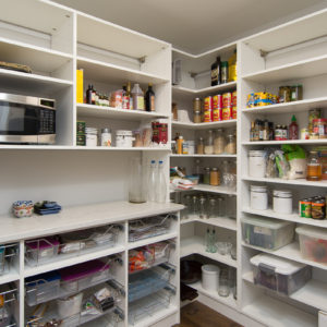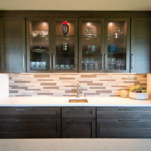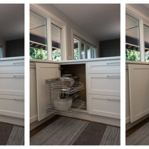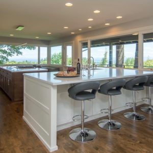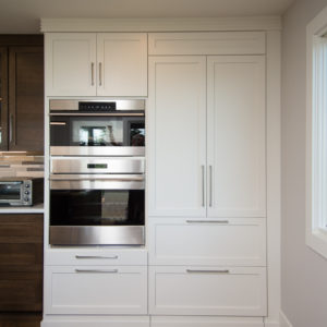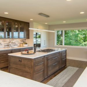 This spacious, transitional kitchen in the Southwest hills of Portland blends classic style with modern function. It features Shaker style cabinetry in soft white with a contrasting island, and secondary prep area with display cabinets, in medium stained rift cut oak run on a horizontal grain. We eliminated upper cabinets on one side and ran the countertops right into the windowsill for a completely unobstructed, panoramic view. A hidden pantry is a fun way to have loads of storage out of site. Specialized pull-outs make the most of every cabinet, while Sub-Zero Wolf appliances throughout offer top of the line luxury.