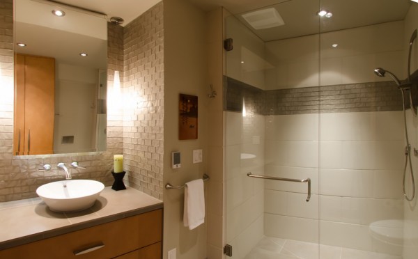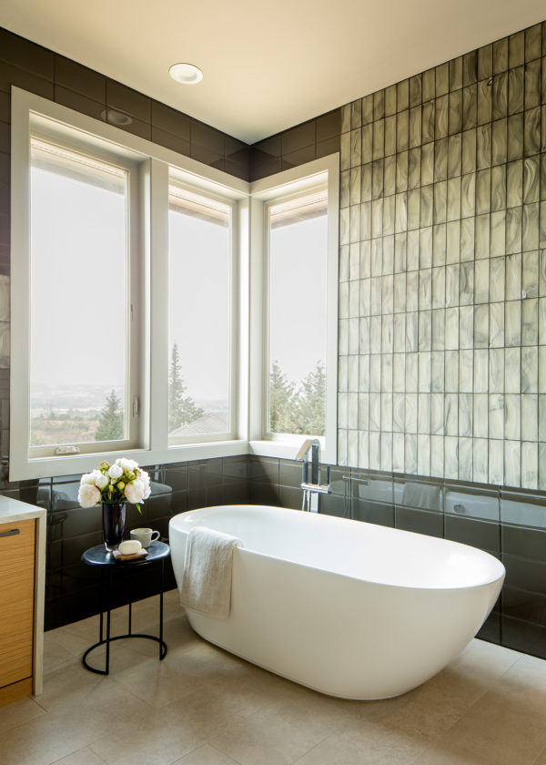 These clients were building their dream home and this bathroom needed to pull out all the stops. A sensational glass tile focal point wall behind the freestanding tub is an incredible spot to relax and take in the sunlight. The yard is quite private, so you get to enjoy the view all of the time.…